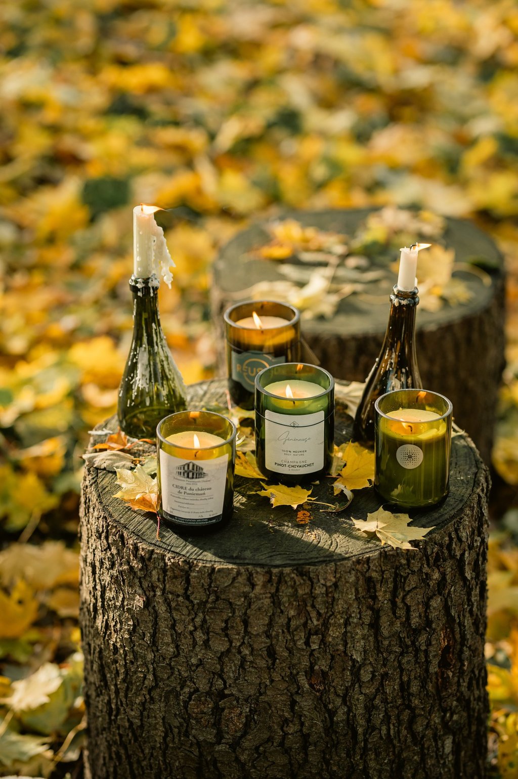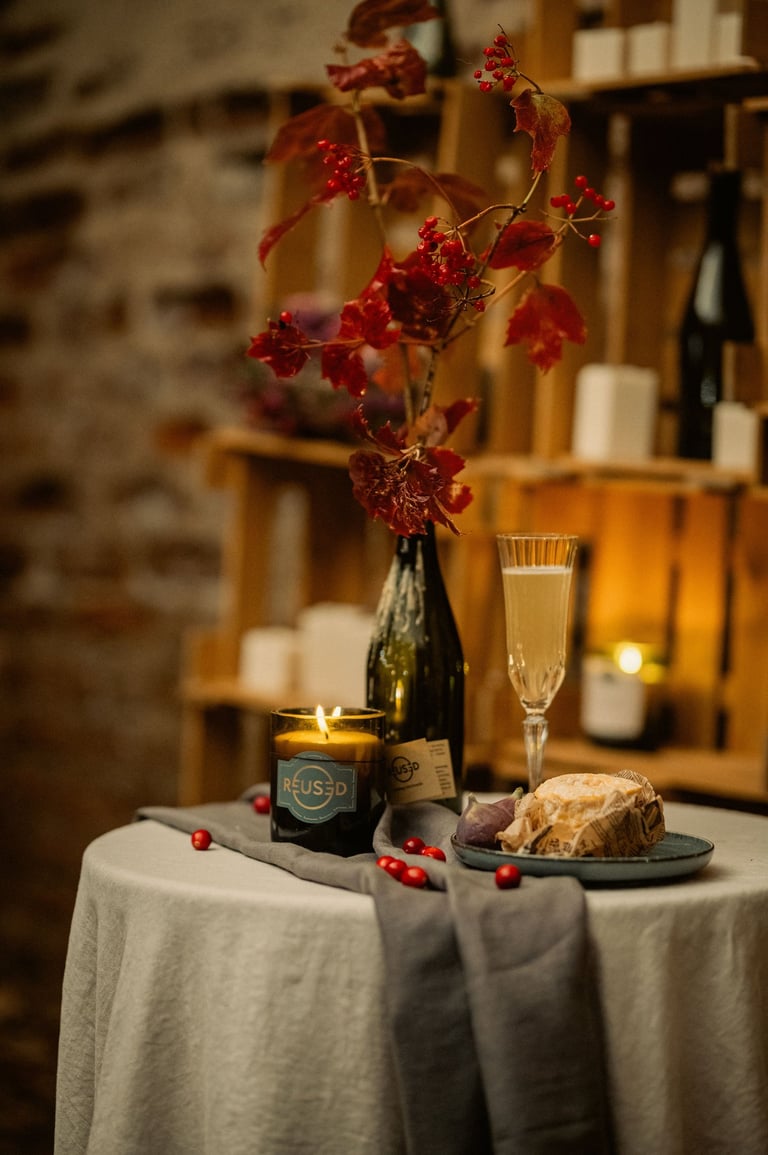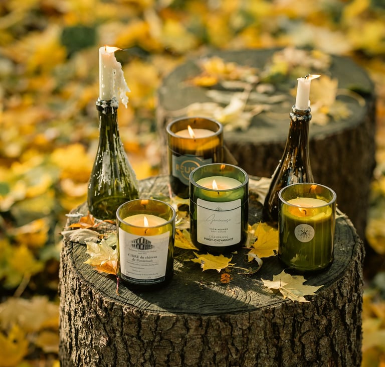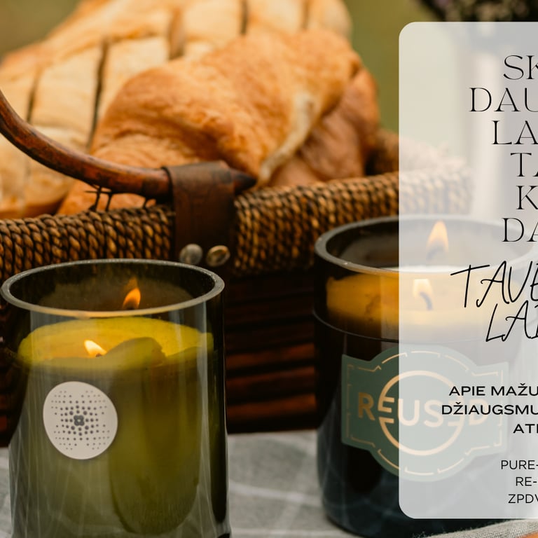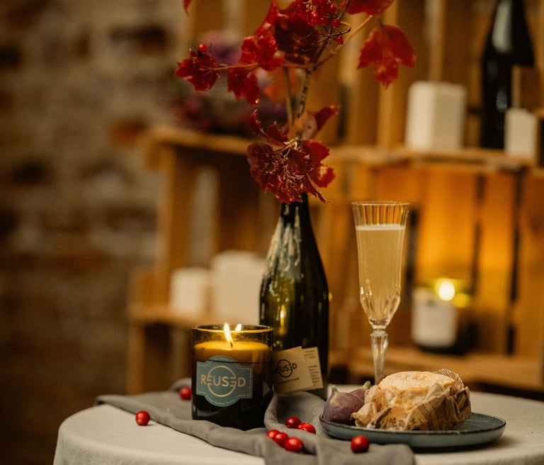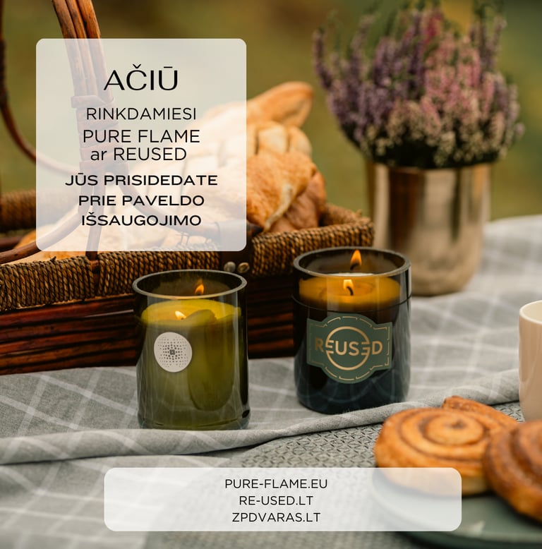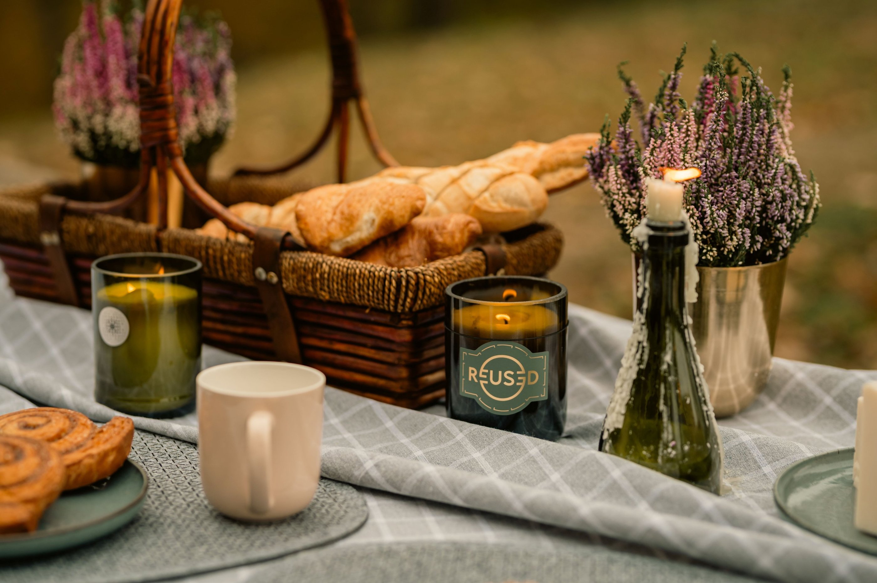 Pirmieji REUSED produktai - žvakių ir žvakidžių kolekcija, kur kiekviena antram gyvenimui prikelto butelio detalė tampa nauja ir stilinga tvaraus interjero detale.