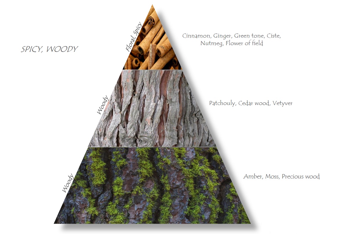 Kvapo natos: pačiulis, kedras, vetiveris, gintaras, samanos, mediena, cinamonas, imbieras, muskato riešutas.